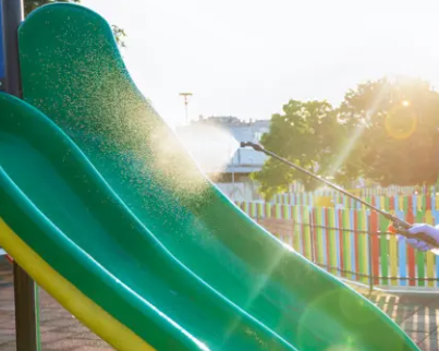 We use a low-pressure, non-toxic sanitization method designed for childcare centers, schools, and community parks.
